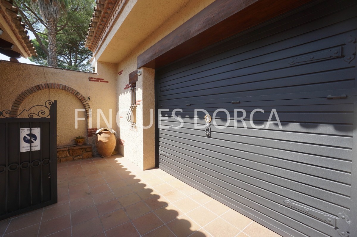 The outdoor space includes a closed garage for two vehicles, a garden, and functional terraces surrounding the house. A large pool faces an outdoor porch, offering absolute privacy and unobstructed sea views.